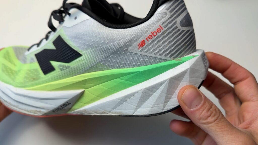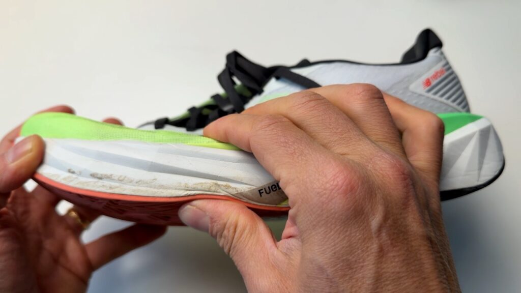 Cuore Tecnologico: L’Intersuola e la Leggerezza Il vero motore di questa scarpa è la nuova intersuola. New Balance ha optato per un mix di PEBA e EVA . La presenza del PEBA è fondamentale perché dona quella reattività extra che spesso manca nelle schiuma in EVA standard . È importante sottolineare che nel mezzo non c’è nessun tipo di piastra: né plastica, né carbonio . C’è solo questo strato di intersuola morbida e reattiva che lavora sotto il piede.