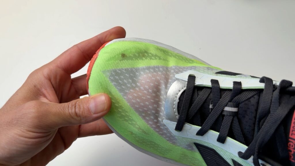 Nonostante l’aumento di spessore, il peso rimane contenutissimo: 223 grammi dichiarati . Anche nel mio numero, un 45 (o meglio, un 44 e mezzo come vedremo dopo), la scarpa rimane leggerissima . La tomaia in mesh tecnico contribuisce a questa leggerezza: è traspirante e sottile, non presenta doppi o tripli strati pesanti . Questo la rende perfetta per i periodi primaverili ed estivi, anche se forse d’inverno, con temperature molto rigide, potrebbe risultare fin troppo fresca .